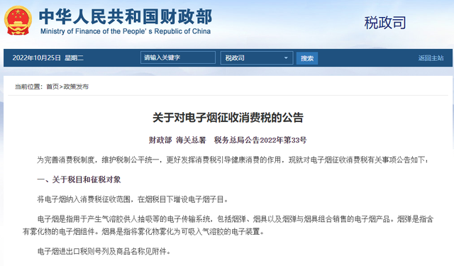 為完善消費稅制度,維護稅制公平統(tǒng)一,更好發(fā)揮消費稅引導健康消費的作用,現(xiàn)就對電子煙征收消費稅有關事項公告如下: