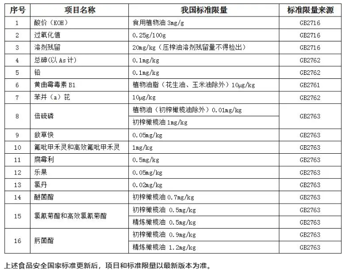 進(jìn)口食用橄欖油食品安全衛(wèi)生指標(biāo)應(yīng)該符合現(xiàn)行的GB2716《食品安全國(guó)家標(biāo)準(zhǔn)植物油》、GB2761《食品安全國(guó)家標(biāo)準(zhǔn)食品中真菌毒素限量》、GB2762《食品安全國(guó)家標(biāo)準(zhǔn)食品中污染物限量》和GB2763《食品安全國(guó)家標(biāo)準(zhǔn)食品中農(nóng)藥最大殘留限量》等,現(xiàn)將部分相關(guān)衛(wèi)生指標(biāo)和強(qiáng)制指標(biāo)梳理如下: