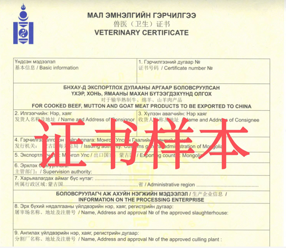 蒙古國官方已向中國海關(guān)總署備案確認(rèn)蒙古國熟制牛羊肉產(chǎn)品獸醫(yī)衛(wèi)生證書樣式、官方印章及官方獸醫(yī)簽字等相關(guān)信息。進(jìn)口蒙古國熟制牛羊肉產(chǎn)品應(yīng)附有蒙古國官方出具的獸醫(yī)衛(wèi)生證書,并加蓋官方印章和官方獸醫(yī)簽字,同時(shí)向中國海關(guān)推送對應(yīng)蒙古國輸華肉類衛(wèi)生證書電子信息。