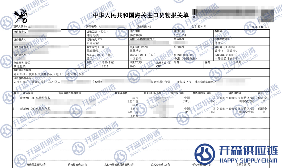 【本文結語】 上述就是車載導航儀退運(返修)進出口報關代理服務【清關案例】的全部內容,希望能對您有所幫助,如有進口報關,進口報關代理公司,進口報關代理上任何疑問及問題可隨時在線聯系我們或撥打 18002611553,開森供應鏈擁有豐富的進口報關,進口報關代理公司,進口報關代理操作經驗及案例,10余年進口經驗為您所用,各類進口疑難都能為您一一解答及協助快速處理解決!